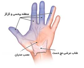 1- سوزن سوزن شدن و بی حسی نوک انگشتان به خصوص در انگشت میانی و اشاره که ابتدا به دنبال فعالیت حادث می شود و به تدریج در هنگام استراحت هم ایجا د می شود و بخصوص در شب افزایش می یابد که بسیار آزار دهنده است.