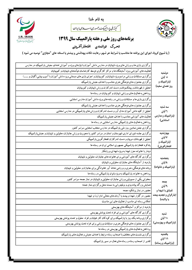 با توجه به شرایط موجود و همه گیری بیماری کرونا، اجرای برنامه های هفته ملی پارالمپیک امسال متناسب با شرایط هر شهر، رعایت نکات بهداشتی و تاکید بر نسخه های مجازی، توصیه شده است.