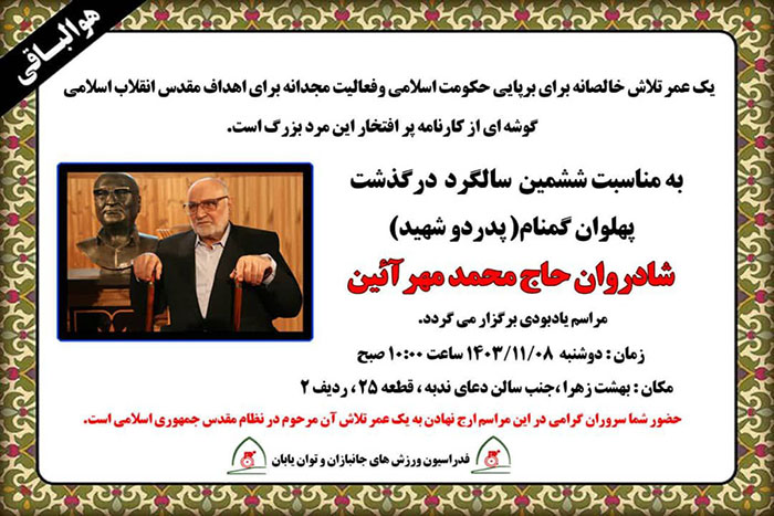 مراسم ششمین سالگرد درگذشت پهلوان گمنام، حاج محمد مهرآیین برگزار می شود.